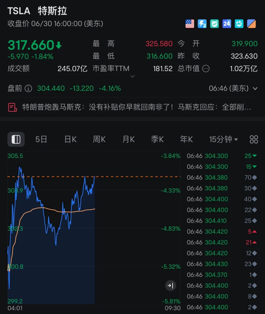7月1日,特斯拉美股盤(pán)前跳水一度跌超7%。截至發(fā)稿,特斯拉仍跌超4%。
