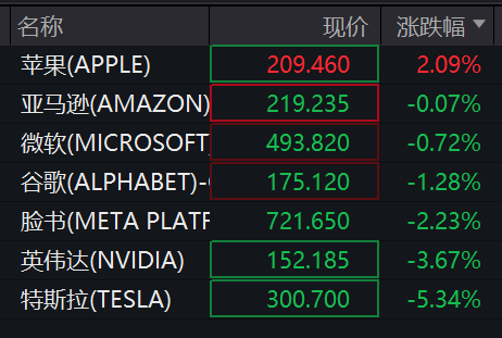 美國科技七巨頭除蘋果外均出現下跌。其中,英偉達跌超3%,特斯拉跌超5%。